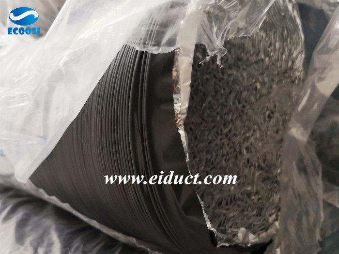 Ecoosi HVAC PVC aluminum ventilation flex duct hose is made of PVC foil bonded with aluminum and steel wire. This air duct hose with both PVC and aluminum body could handle hot and cold temperatures, with a working range from -20℃ to +150℃. Besides, this PVC aluminum flex ducting hose is extremely flexible and compressible, so it is very easy to transport or store.