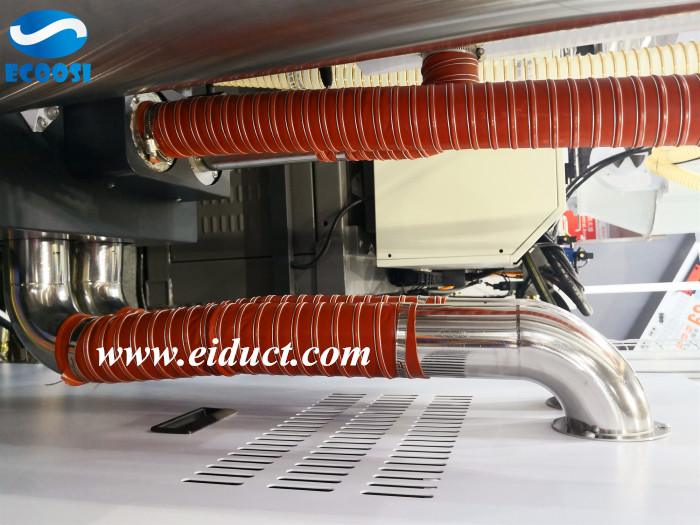 Ecoosi flexible duct hose - High-Temperature Silicone Air Duct Hose is a high temp duct suited for a variety of applications such as hot air and fumes. This flex high temp silicone duct hose consists of double-layer silicone coated fiberglass reinforced with a spring steel wire helix & external filament fiberglass cord. The silicone 2 ply hose allows the high-temperature duct to be suited for high temp air handling applications that are ideal for plastic processing operations. The Ecoosi's double layer silicone air duct hose is also a flexible air ventilation hose that has a narrow pitch for flexible venting. This double layer silicone duct hose pipe allows the hose to offer a tight bending radius that is non-kinking while maintaining a smooth airflow. While the flexible silicone ventilation hose allows for flexible venting, it is not recommended for continuous flexing.